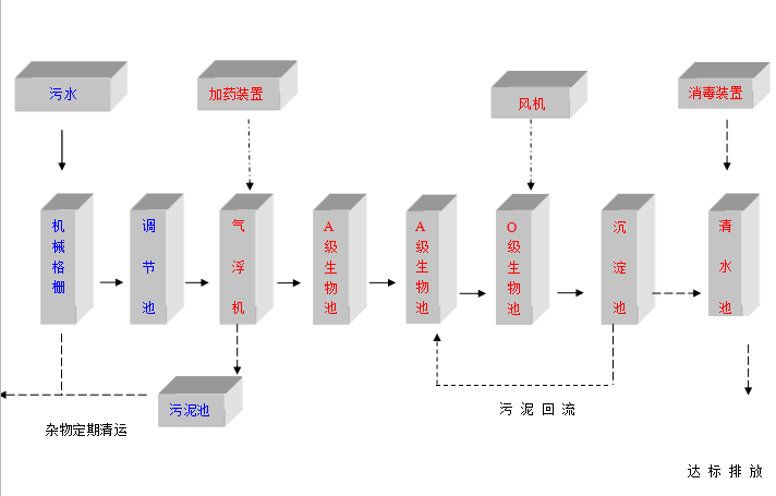 針對該項(xiàng)目具體污水水質(zhì)的特點(diǎn),本方案擬采用常規(guī)的“氣浮機(jī)(加藥)+A/O/O生物接觸氧化+消毒設(shè)備”工藝,該處理工藝較為成熟,操作運(yùn)行方便,日常費(fèi)用低廉,出水穩(wěn)定,主要設(shè)備為鋼結(jié)構(gòu),考慮到周邊環(huán)境和衛(wèi)生問題,故該污水處理工程決定采用全埋地式結(jié)構(gòu),上部覆土,種植花木、草坪,進(jìn)一步美化環(huán)境。